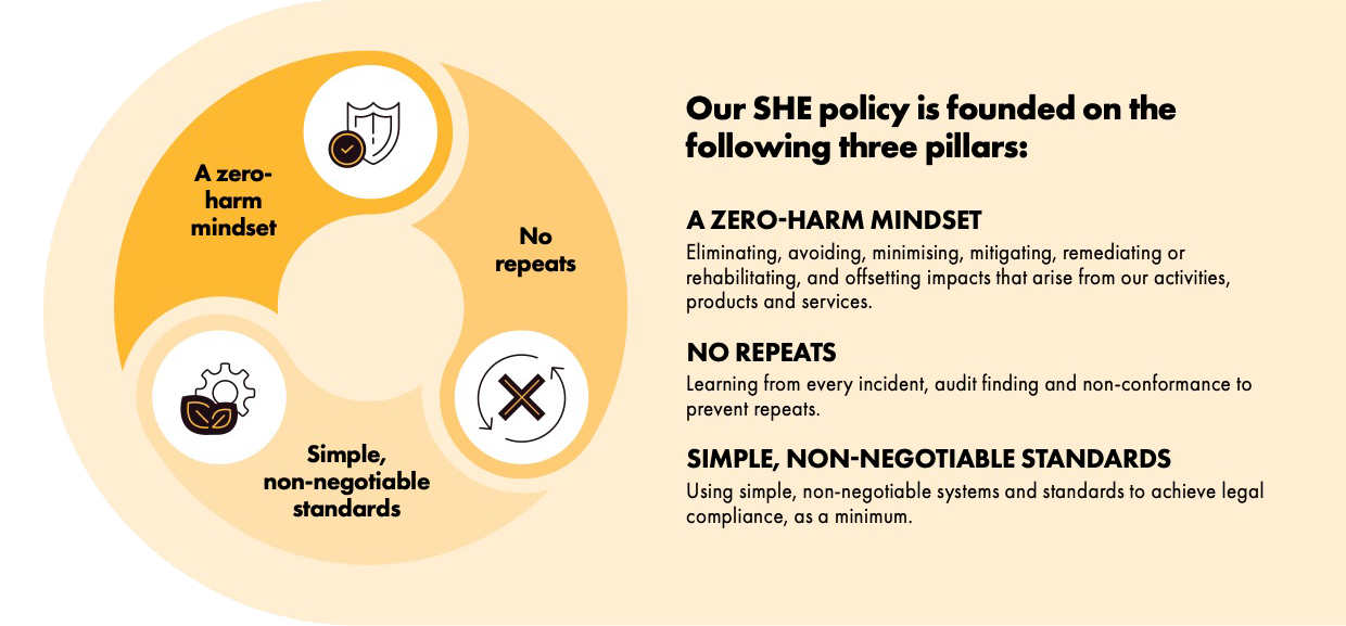 Our overall goal is zero harm, not just in safety and employee health, but also in our interactions with the natural environment. We have ESG targets for water, waste, biodiversity, and climate change to uphold our commitment to responsible stewardship of natural resources, while minimising environmental risks to host communities.
